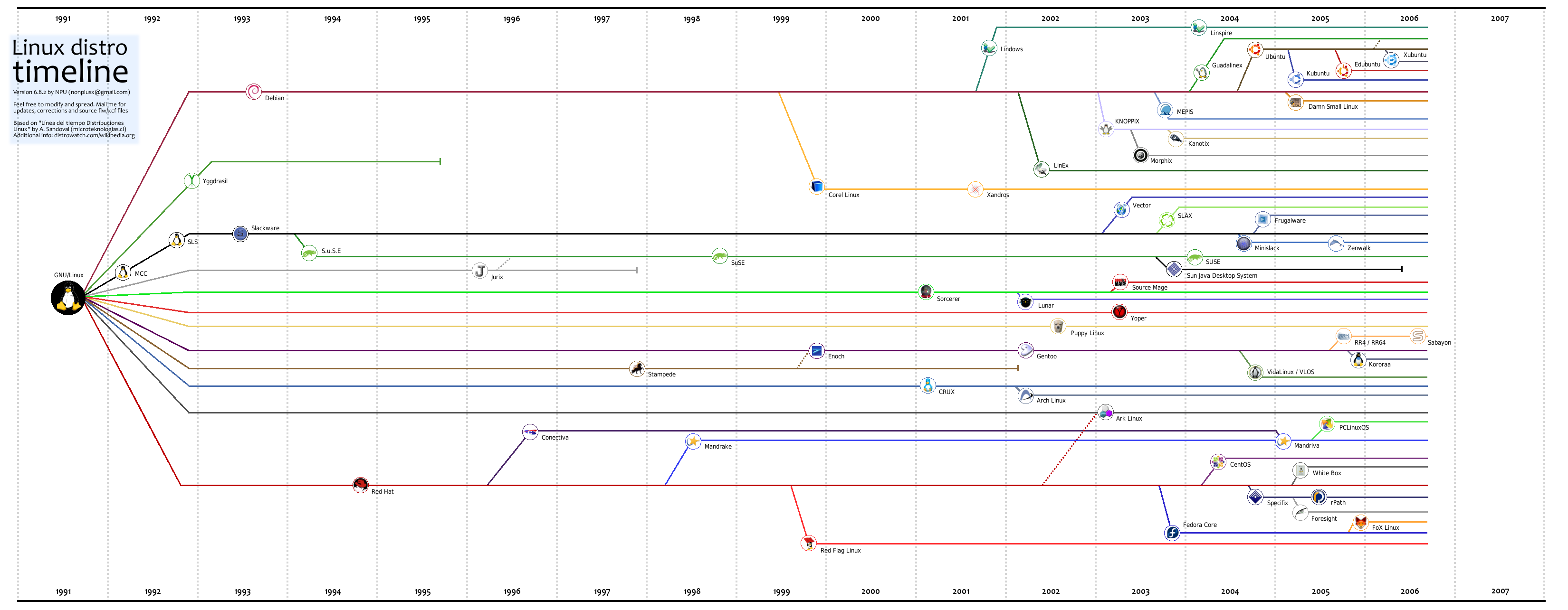 An awesome timeline showing the history of MANY Linux distributions (2006 version).